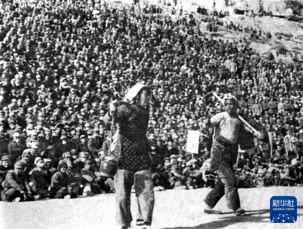 延安魯迅文藝學院王大化、李波在廣場為群眾演出秧歌劇《兄妹開荒》。吳印咸 攝