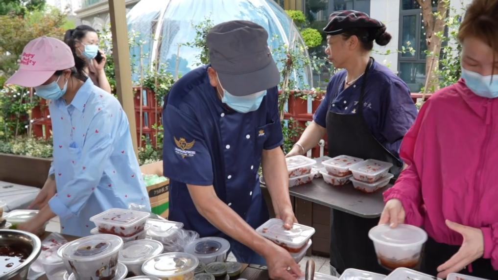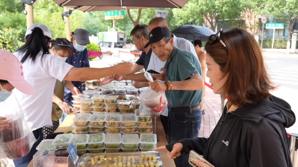 下午三點,在位于浙江湖州市吳興區龍泉街道祥和社區旁的一家飯店門前,市民朋友們已經排起了長隊。店員們將剛出鍋的菜品陸續擺上戶外的長桌,十幾道菜品色香味俱全,路過的市民紛紛加入到選購的隊伍中來。