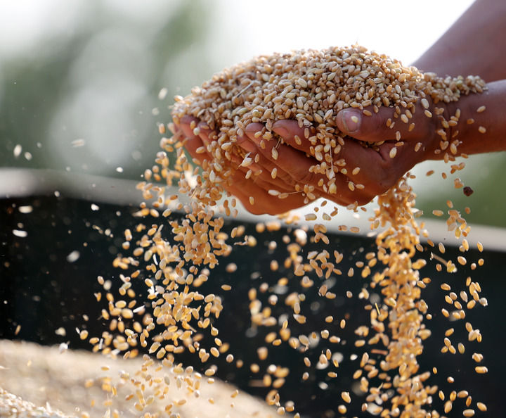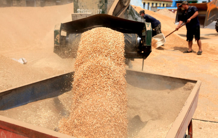 2025年5月28日,山東省臨沂市郯城縣郯城街道農民在查看新收獲的小麥。新華社發(張春雷 攝)