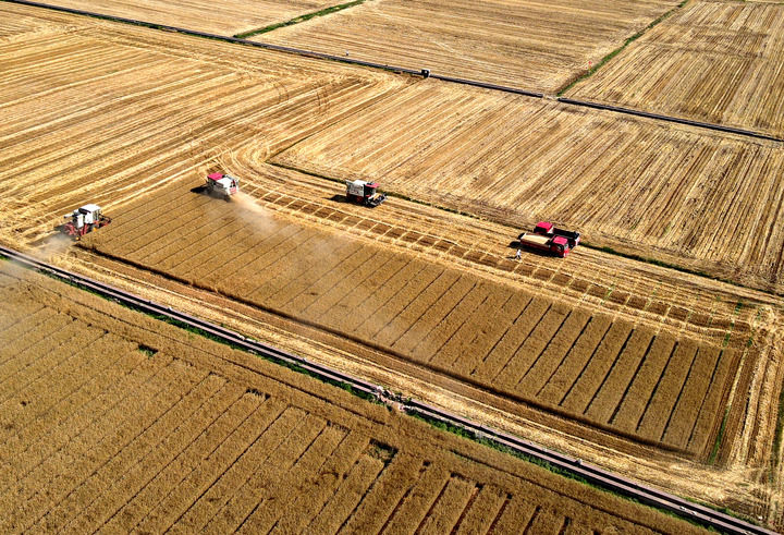 2025年6月13日,農機手駕駛收割機在山東省臨沂市平邑縣仲村鎮田間收割小麥(無人機照片)。新華社發(武紀全 攝)