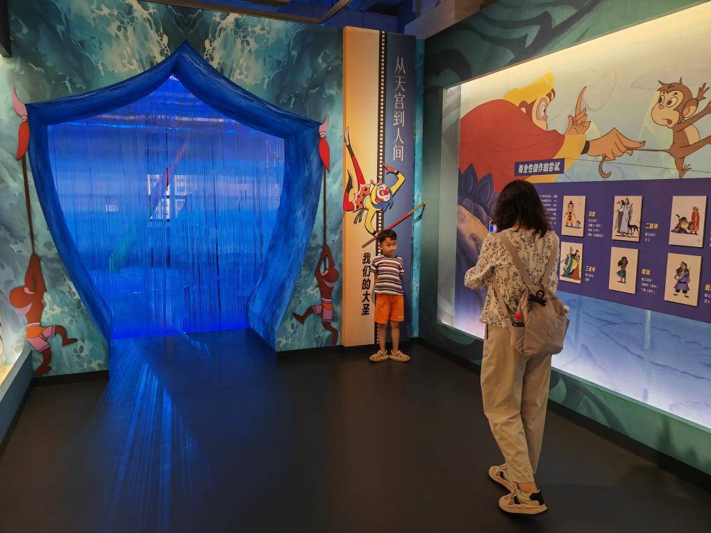 “原來孫悟空有這么多形象,除了電視劇《西游記》,動畫片里還可以看到造型不同的齊天大圣,既有戲曲臉譜的夸張,又不失漫畫的靈動,太好看了?!睂W生黃豆豆一邊說著,一邊與巨型金箍棒合影。在展覽的“大圣空間”內,展出了8部有孫悟空角色的動畫藏品,觀眾可以了解動畫的制作場景和創作者的心路歷程。