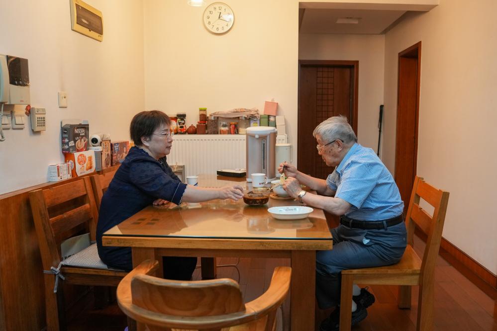 2025年7月11日,王生(右)與女兒王遠在家里吃午飯。