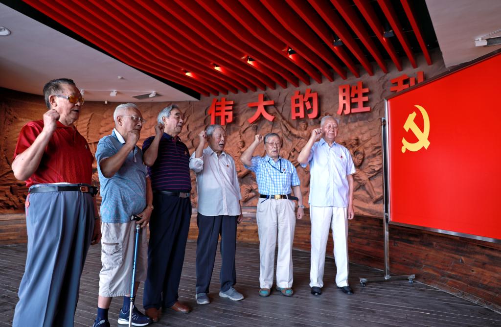 2019年7月4日,在南京渡江勝利紀念館,王生(右二)與南鋼離休老干部重溫入黨誓詞。新華社發(吳斌 攝)
