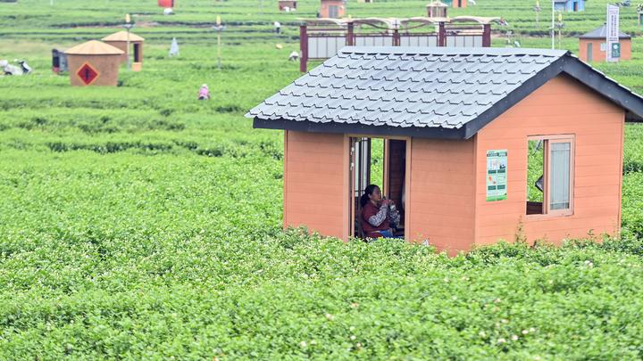 在橫州市中華茉莉園,雷水平勞作后在小舍中休息調整(7月31日攝)。