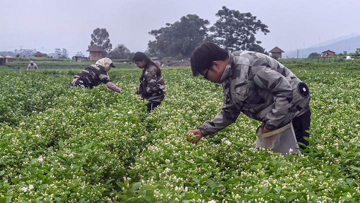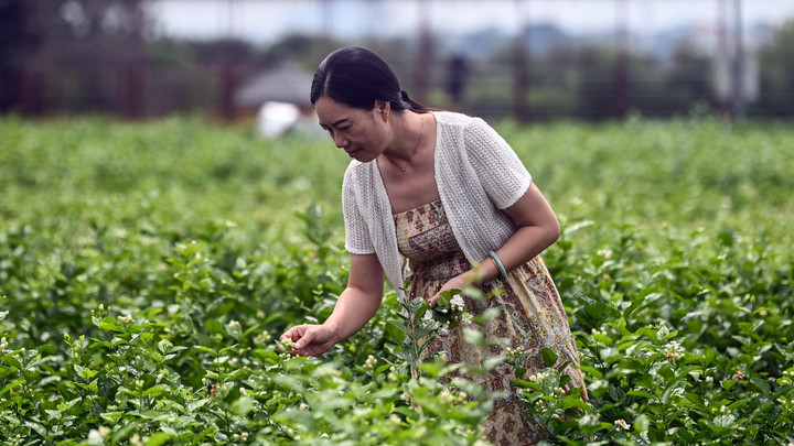 地處桂南的廣西橫州市,憑借富硒沃土與獨特氣候,擁有超過18萬畝的茉莉花田,茉莉花(茶)產量占中國總產量80%以上,占世界60%以上,有“中國茉莉之鄉”美譽。每年夏季是橫州茉莉花采摘季,花田連片,芬芳漫溢,花農在花海中穿梭,一派繁忙景象。