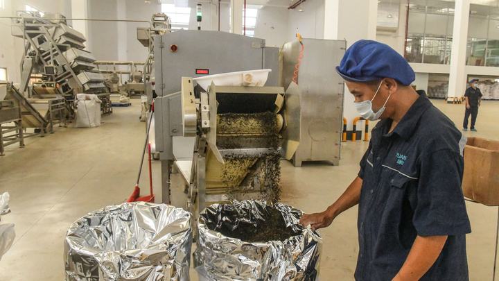 在廣西中肯茶業有限公司拍攝的生產線上的茉莉花茶(7月31日攝)。