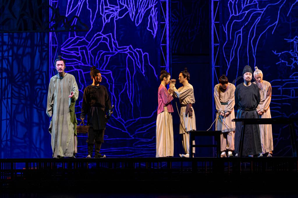 此外,現代感的舞美設計帶來新意。鋼鐵澆鑄的背景架構在幕間旋轉出光影的無窮變化,營造出或是竹林山水、或是行舟江上、或是做客家宴等多重景象。金屬質感的線條框架作為舞美主體,不但創造出“人在畫中走、詩中游”的寫意空間,也營造了剛柔相濟的中國傳統意境。