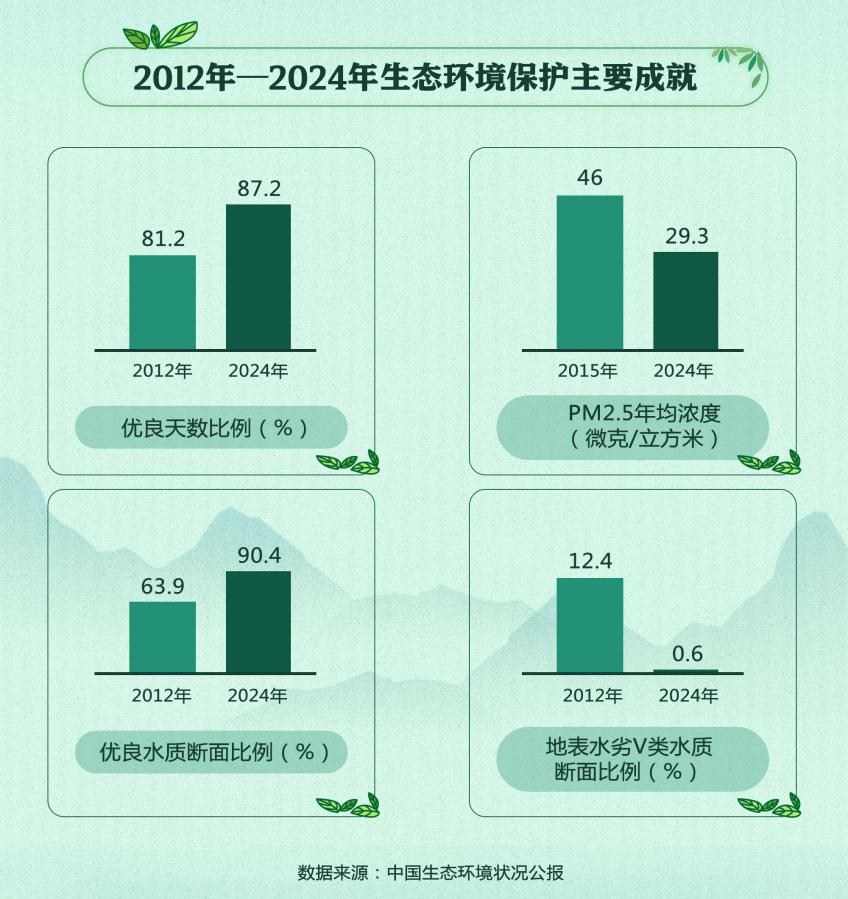 中共十八大以來,中國以前所未有的力度抓生態文明建設,解決了生態環境領域許多長期想解決而沒有解決的難題,辦成了許多過去想辦而沒有辦成的大事,生態文明建設進入認識最深、力度最大、舉措最實、推進最快、成效最好的歷史階段。面對人民群眾日益增長的優美生態環境需要,中國從解決突出生態環境問題入手,制定實施中央生態環境保護督察制度,推動生態文明建設實現了從“部門負責”向“黨政同責、一崗雙責”的重大轉變。注重點面結合、標本兼治,高標準打好污染防治攻堅戰。2024年,全國地級及以上城市細顆粒物(PM2.5)平均濃度為29.3微克/立方米,全國地表水優良水質斷面比例達到90.4%,首次超過90%;長江干流連續5年、黃河干流連續3年全線水質穩定保持Ⅱ類,全國近岸海域水質優良比例達到83.7%,全國24個典型海洋生態系統已消除“不健康”狀態。森林覆蓋率超過25%,全球新增綠化面積約1/4來自中國。生態環境質量明顯改善,藍天白云、清水綠岸、鳥語花香、碧海銀灘等自然美景,又重新回到了人民群眾身邊。