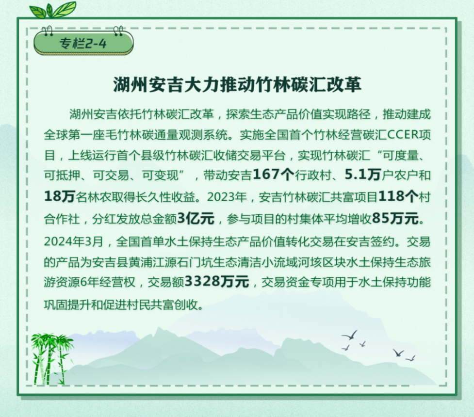 中國正在探索推進林權、水權、碳匯等權益市場交易,進一步豐富和拓展綠水青山就是金山銀山的轉化路徑。2024年印發的《關于發揮綠色金融作用服務美麗中國建設的意見》,提出完善綠色金融產品和服務,拓展綠色金融新業態新模式,讓綠水青山價值更加可感可及。