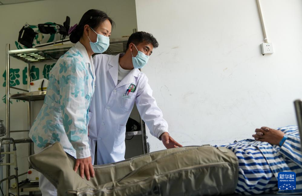 在昌都市洛隆縣人民醫院,從西藏大學醫學院畢業的醫生巴桑扎西和護士為患者進行康復治療(7月21日攝)。新華社記者 晉美多吉 攝