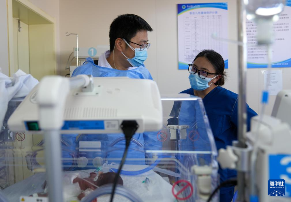 在那曲市人民醫院新生兒重癥監護室,來自大連醫科大學附屬第一醫院的援藏醫生田聰亮(左)和護士旦珍合作為一名早產兒實施機械通氣治療(7月18日攝)。新華社記者 晉美多吉 攝