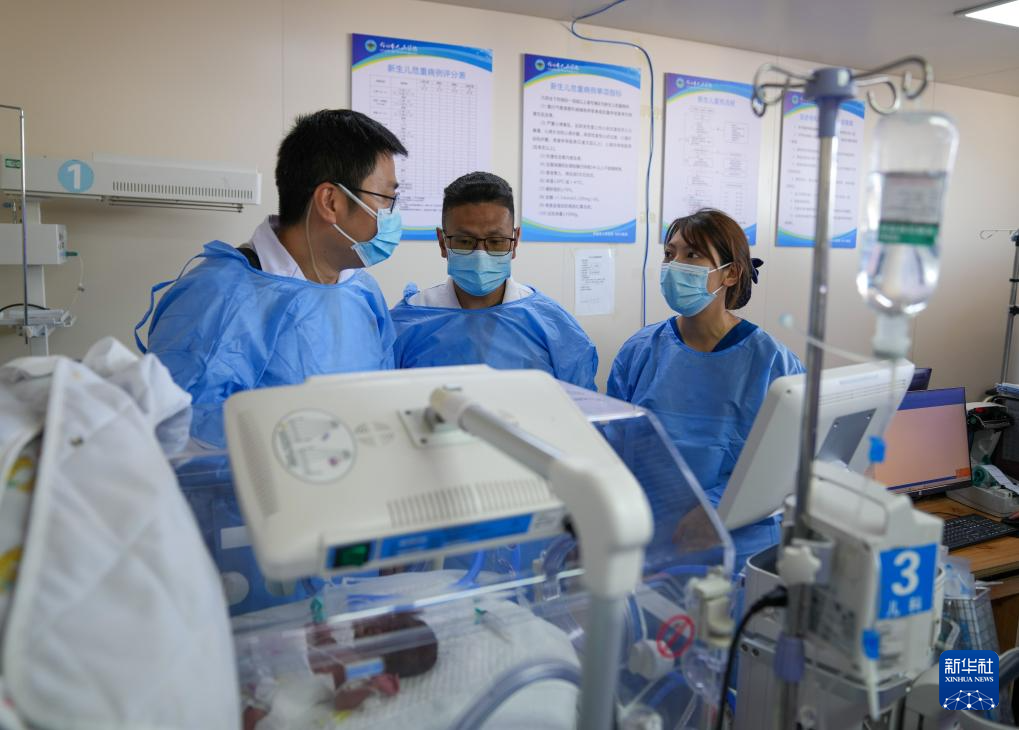 在那曲市人民醫院新生兒重癥監護室,來自大連醫科大學附屬第一醫院的援藏醫生田聰亮(左)與吉美多布杰(中)、護士旦珍合作,為一名早產兒實施機械通氣治療(7月18日攝)。吉美多布杰2003年從四川大學華西醫學院畢業來到那曲市人民醫院工作,他先后和8批援藏專家合作、學習。新華社記者 晉美多吉 攝