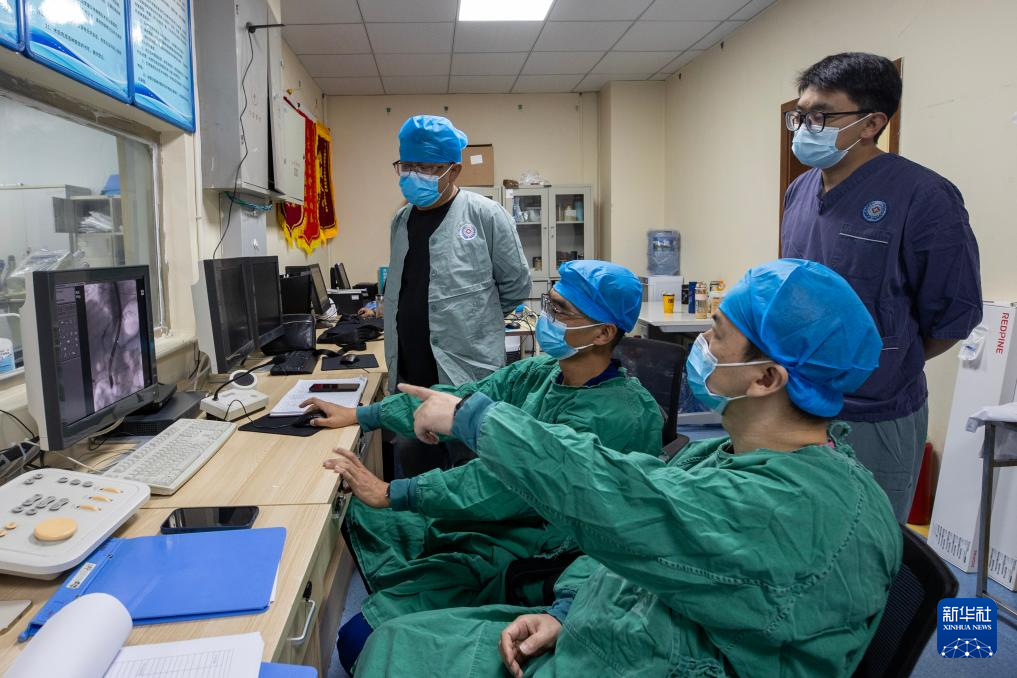 協和醫院第十批援藏醫生王強(左四)、第十一批援藏醫生蔣青偉(左三)和西藏自治區人民醫院醫生扎西(左一)在拉薩為患者施行內鏡逆行胰膽管造影術(8月5日攝)。新華社記者 姜帆 攝