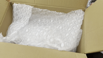 記者購買的某品牌背包拆箱動圖(經加速處理)。巨大的箱子內包裹多層氣泡膜,背包只占很小體積。