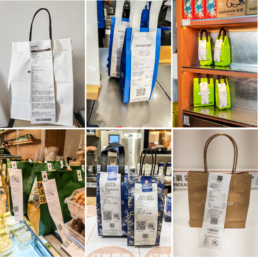 此外,外賣包裝上裝訂的小票也越來越長,除了產品信息和配送地址,還標注著品牌簡介、理念、加盟二維碼等非必要信息,消費者常常在瞥過一眼之后即丟棄。這些小票的熱敏紙,也無法像普通紙張一樣回收利用。