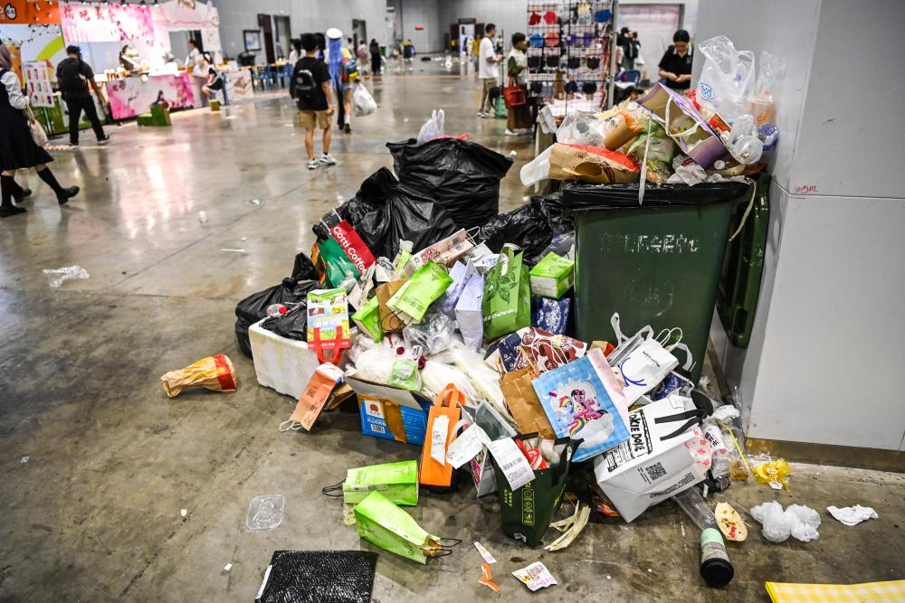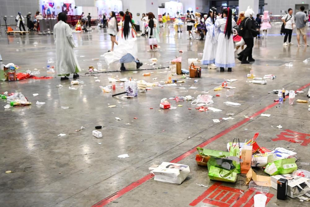 廣西南寧國際會展中心舉行的漫展現場,大量精致的外賣包裝袋被隨地丟棄(8月2日攝)。
