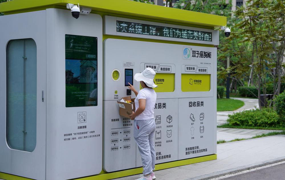 市民在長春市一小區內使用智能回收設備回收快遞紙箱(8月11日攝)。