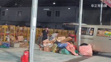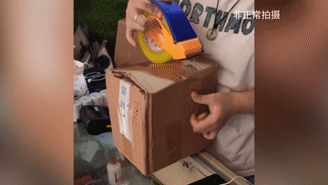 一處快遞營業網點,工作人員使用膠帶過度纏繞快遞箱(8月1日攝,動圖經加速處理)。