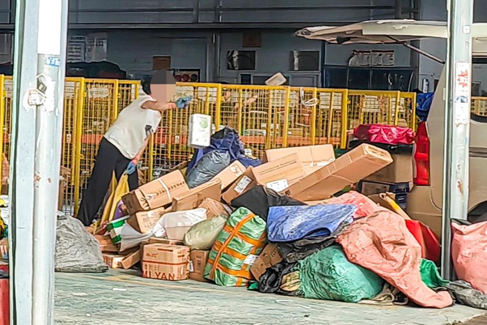 在廣西南寧國際會展中心的垃圾堆放區,一位廢品撿拾者在撿拾可回收的廢品(8月3日攝)。