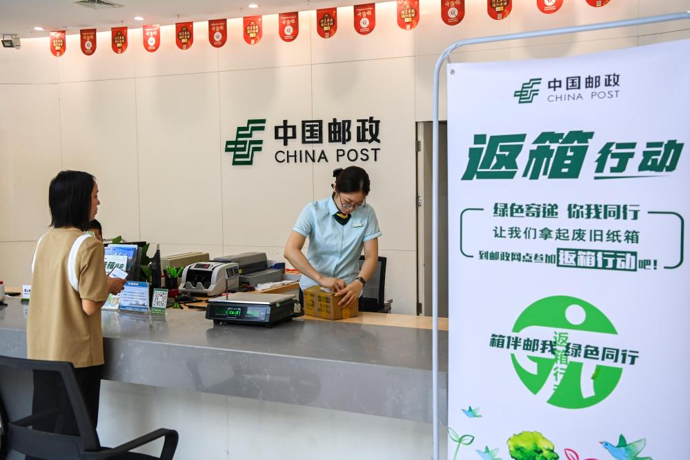 在廣西南寧一處中國郵政寄遞網點,工作人員(右)使用回收的包裝箱為顧客包裝快遞(8月1日攝)。
