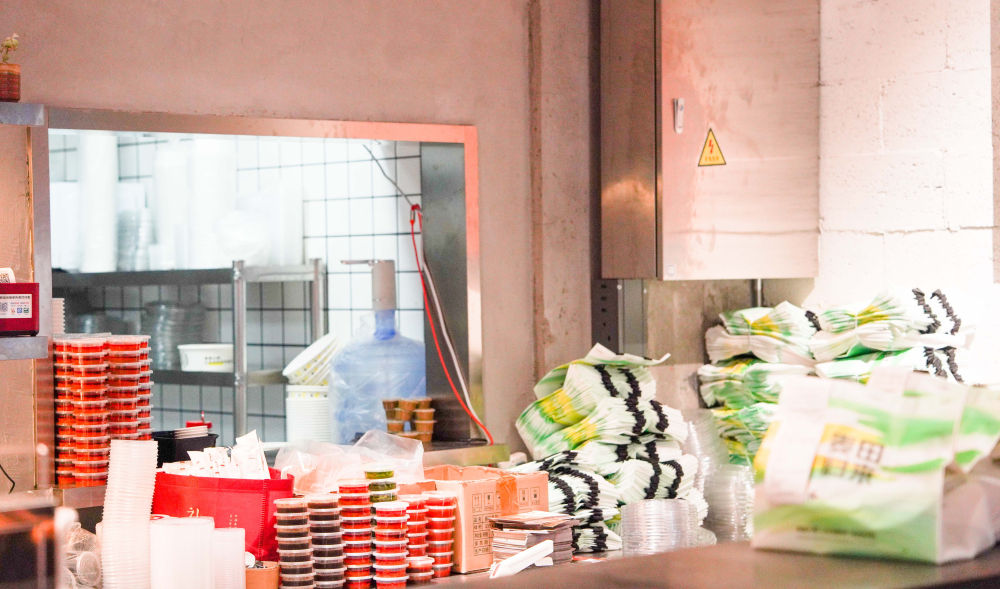 吉林省吉林市一家輕食店出餐口堆放的外賣包裝(8月12日攝)。
