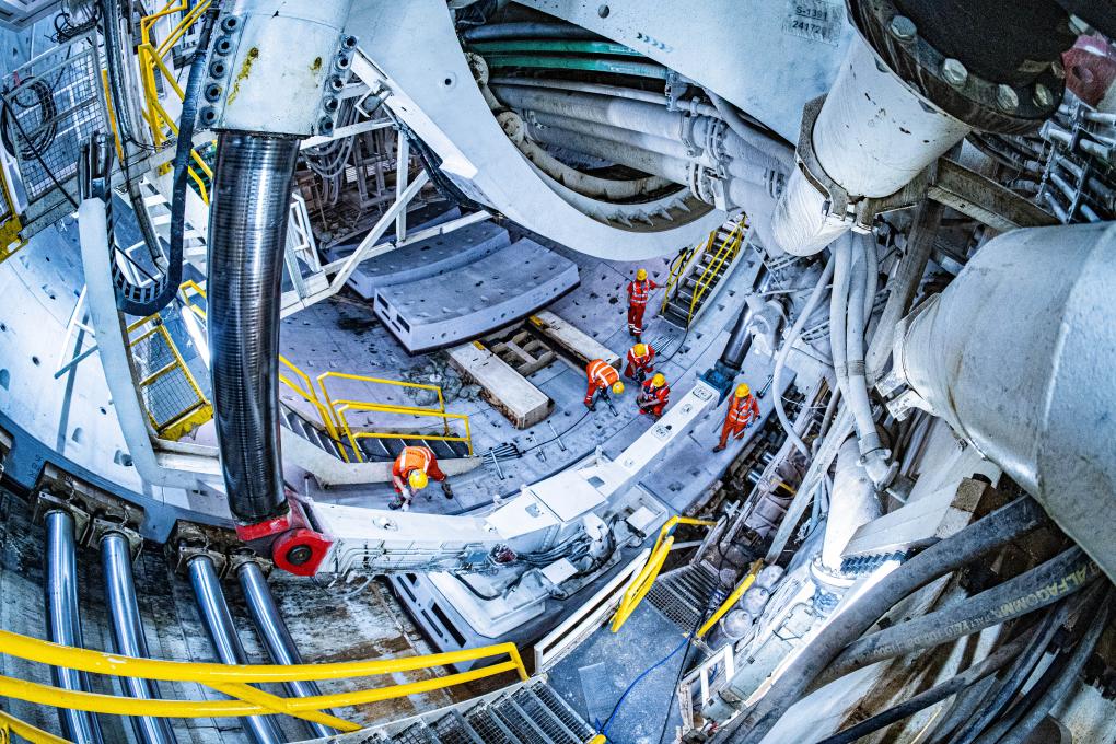 在濟南市黃崗路黃河隧道盾構作業現場,建設者對拼裝好的管片進行加固。(受訪單位供圖)
