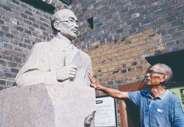 8月1日,78歲的梅氏家族長輩梅華林在梅汝璈故居院中瞻仰梅汝璈雕像。新華社記者萬象攝