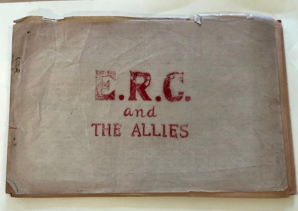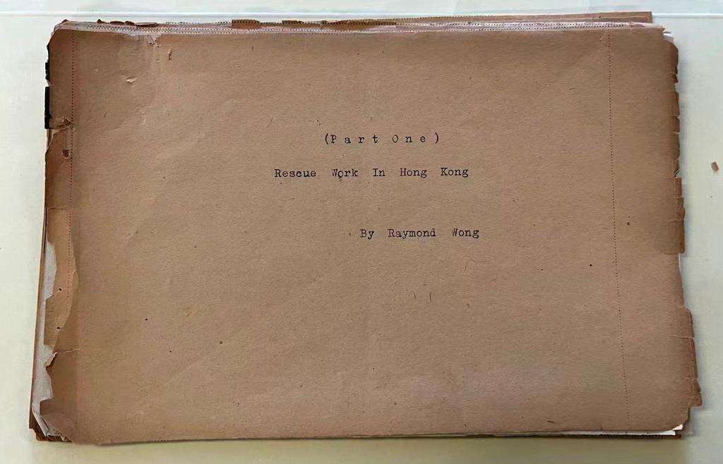 這是一本普通信紙大小、紙張泛黃發黑的筆記,封面用紅字寫著《東江縱隊與盟軍》。這份檔案未經裝訂,只用別針夾著,頁邊已脆化。