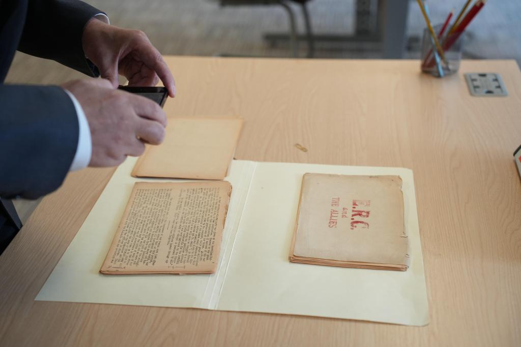 這是8月21日在位于英國曼徹斯特市的人民歷史博物館拍攝的由曾參加東江縱隊的新華社倫敦分社首任社長黃作梅主筆編撰的東江縱隊援救盟軍人員的檔案資料。(新華社記者吳黎明攝)