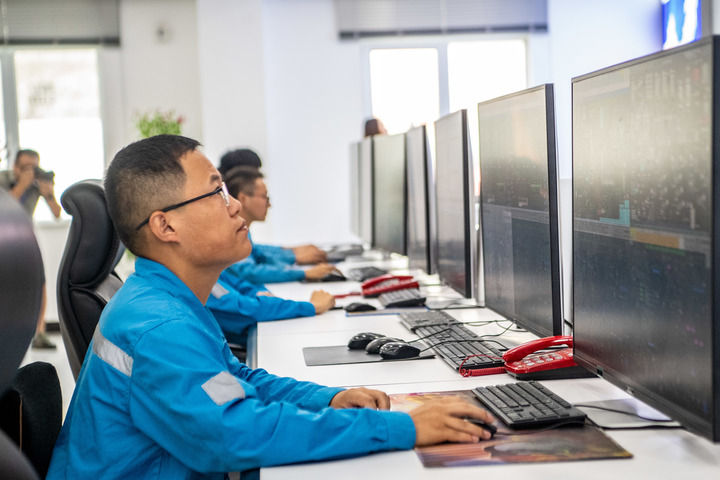 8月15日,在重慶市忠縣的重慶海螺水泥有限責任公司,工作人員通過大數據對工廠運行進行監測。新華社記者 唐奕 攝