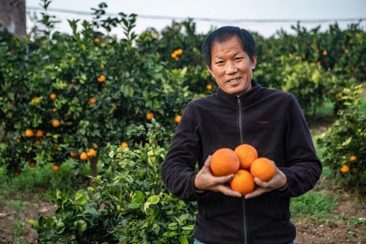 2023年11月28日,在重慶奉節縣草堂鎮歐營村,村民在展示剛剛采摘的臍橙。新華社記者 唐奕 攝
