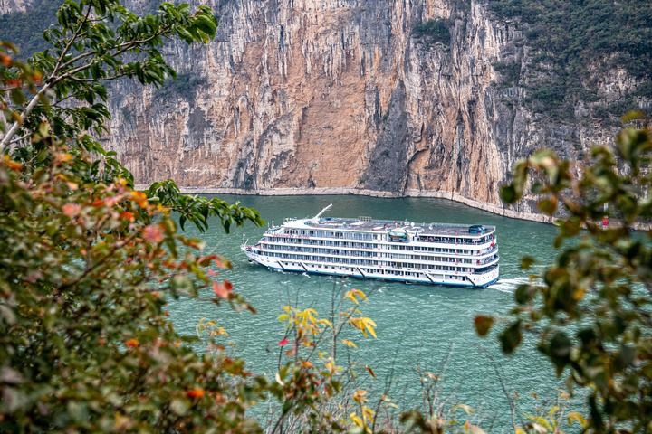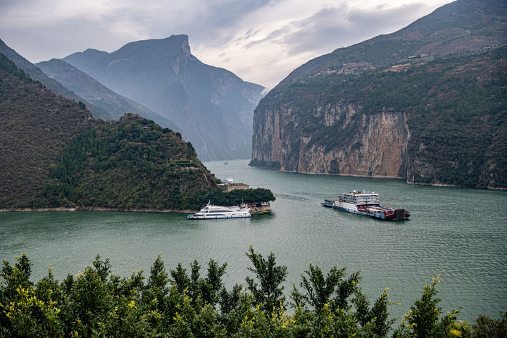 2023年11月29日,一艘游船從重慶市奉節縣長江瞿塘峽夔門駛過。新華社記者 唐奕 攝