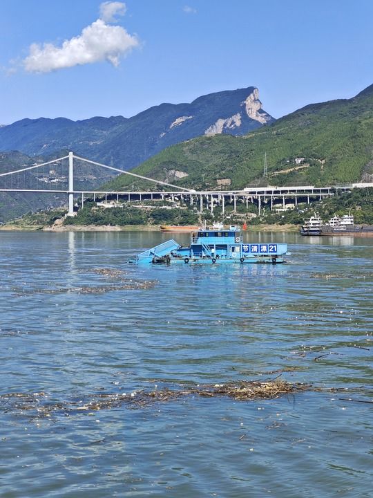 8月的重慶,正值汛期。記者在瞿塘峽口夔門江面看到,兩艘船身標有“奉節清漂”的藍色機械化清漂船在江面上快速往返穿梭,連續暴雨帶進江中的秸稈、樹枝等漂浮物被迅速“吸”入艙內。