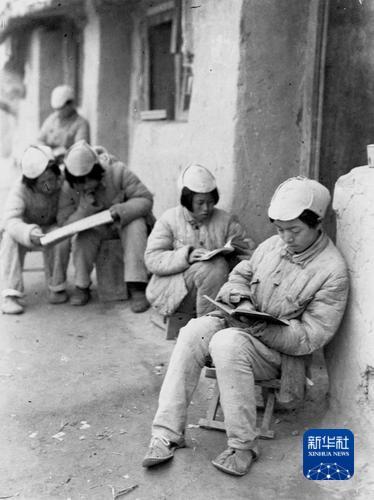 陜北公學學生在室外閱讀。徐肖冰 攝