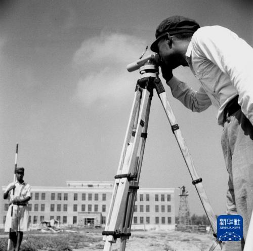 1951年,工程技術人員在中國人民大學建設工地測量。丁一 攝