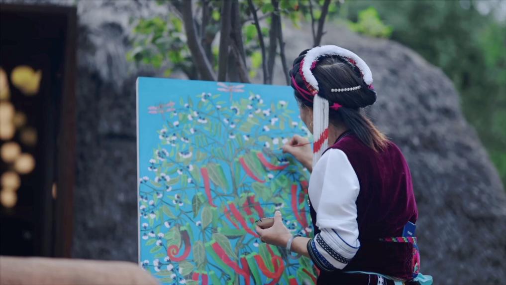 云南大理雙廊鎮伙山村有個農民畫社,92歲的王秉秀老人從78歲起拿起畫筆,把繡花的技法用到繪畫上,將田間的耕耘、山間的景致、世代相傳的民俗風情融入畫作。