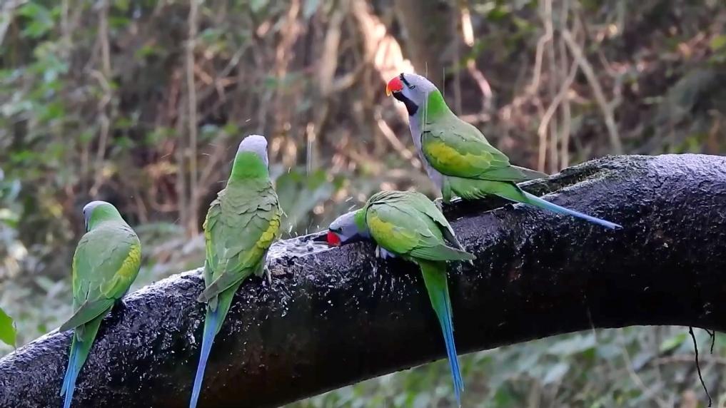 近日,在云南省普洱市思茅區思茅港鎮茨竹林村芒壩村民小組,成群的國家二級保護動物大紫胸鸚鵡飛臨村子周圍的榕樹嬉戲。
