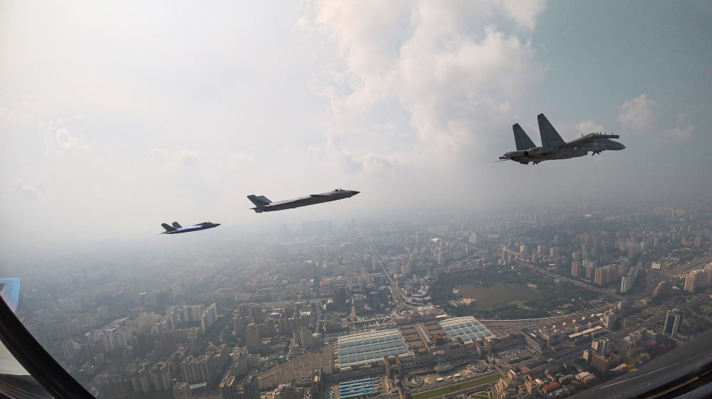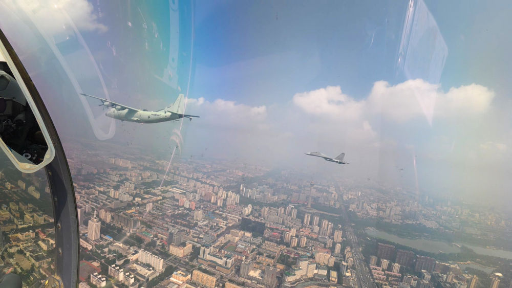 ↑這是殲擊機梯隊從北京城區上空飛過。