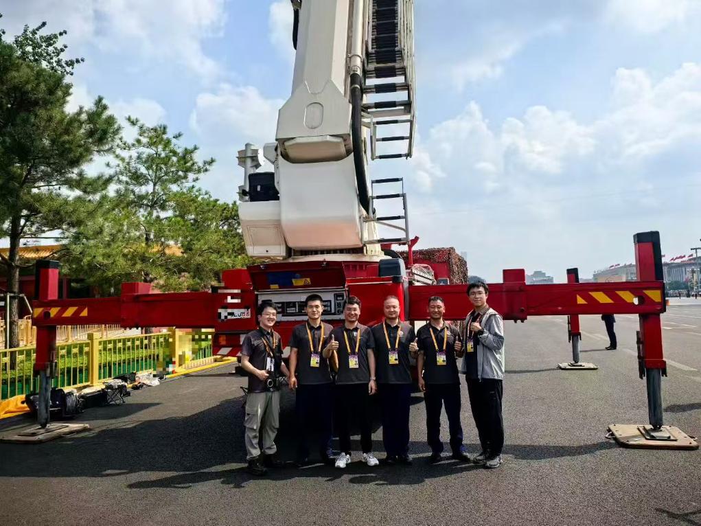 清風輕撫臉頰。腳下的長安街肅穆寧靜,空氣中已經彌漫著莊嚴的氣息。為了這一刻,我們已演練三次:不斷調整云梯的伸展角度,只為盡可能靠近長安街中線,確保拍攝效果完美。
