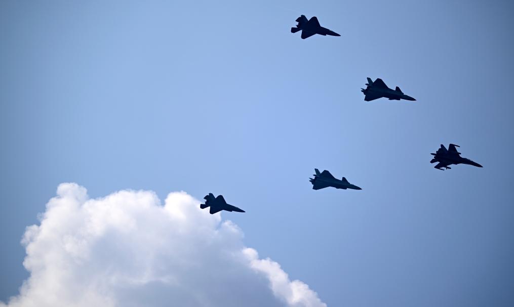 我國自主研制的艦載固定翼預警機空警-600和4架殲-15T組成楔隊,按實戰化要求混合編組,共同接受祖國和人民檢閱。