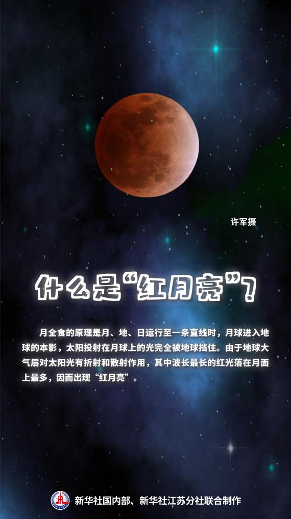 全食階段的月亮為什么是“紅月亮”?王科超解釋說,月全食的原理是月、地、日運行至一條直線時,月球進入地球的本影,太陽投射在月球上的光完全被地球擋住。由于地球大氣層對太陽光有折射和散射作用,其中波長最長的紅光落在月面上最多,因而出現“紅月亮”。