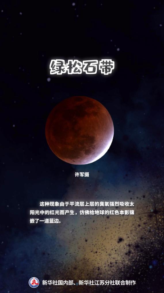 月全食還有一個可供觀賞的“彩蛋”較少被公眾了解——綠松石帶。這種現象由于平流層上層的臭氧強烈吸收太陽光中的紅光而產生,仿佛給地球的紅色本影鑲嵌了一道藍邊?!叭绻恳曈^測,建議借助較高倍率的望遠鏡,從生光開始關注,有望在月球上捕捉到一抹藍色的光帶,那就是綠松石帶?!痹S軍說,在月食的偏食階段,使用相機以月球在地影中的暗部為基準加大曝光,拍攝綠松石帶比較容易。