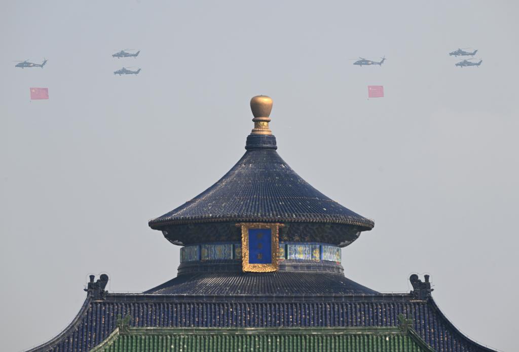 在此次大會上,教練機梯隊拉出彩煙飛越天壇祈年殿上空的震撼畫面,引發熱議,全網刷屏。