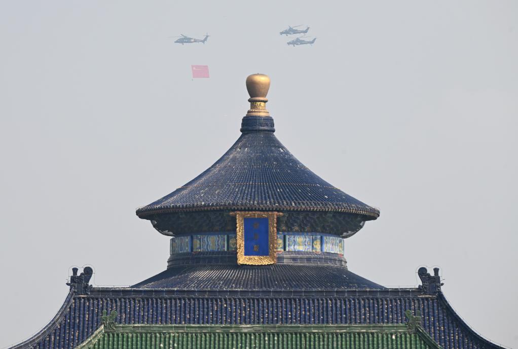 9時45分左右,空中護旗梯隊懸掛黨旗、國旗、軍旗和巨幅標語飛越天壇,頃刻間快門聲此起彼伏,眾多游客、攝影愛好者無不將目光和鏡頭投向同一個方向。