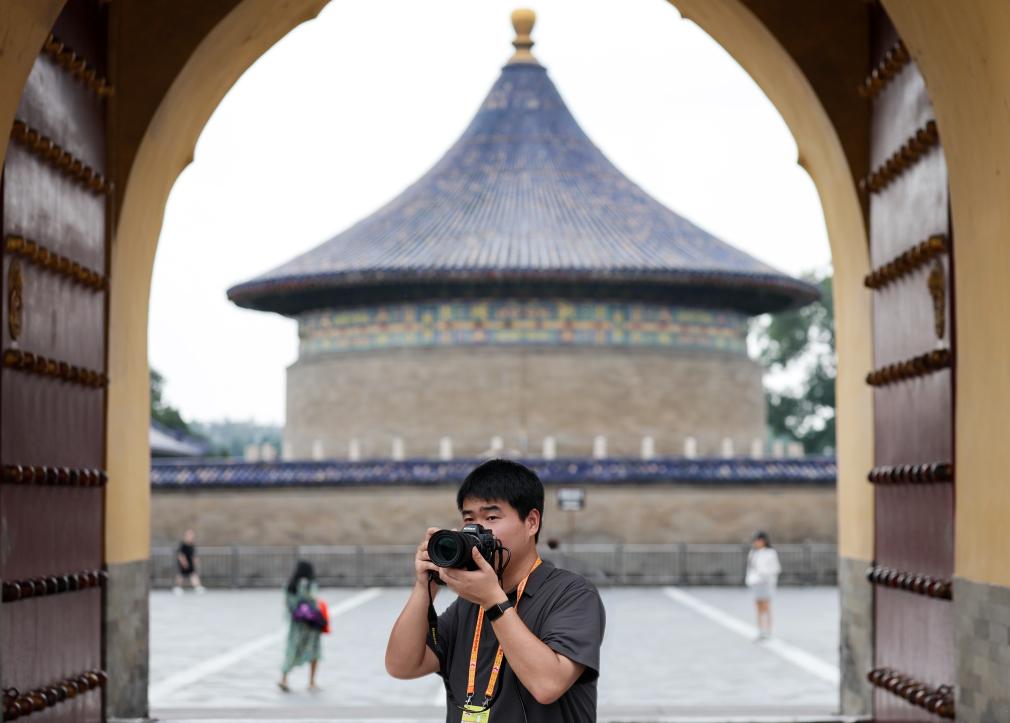 在此次報道中,我與同事丁洪法共同負責天壇公園點位的拍攝任務,目標是捕捉空中梯隊與天壇地標同框的標志性畫面。