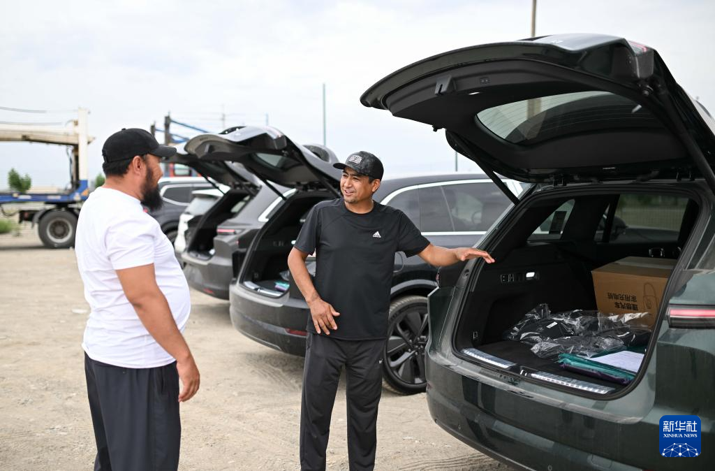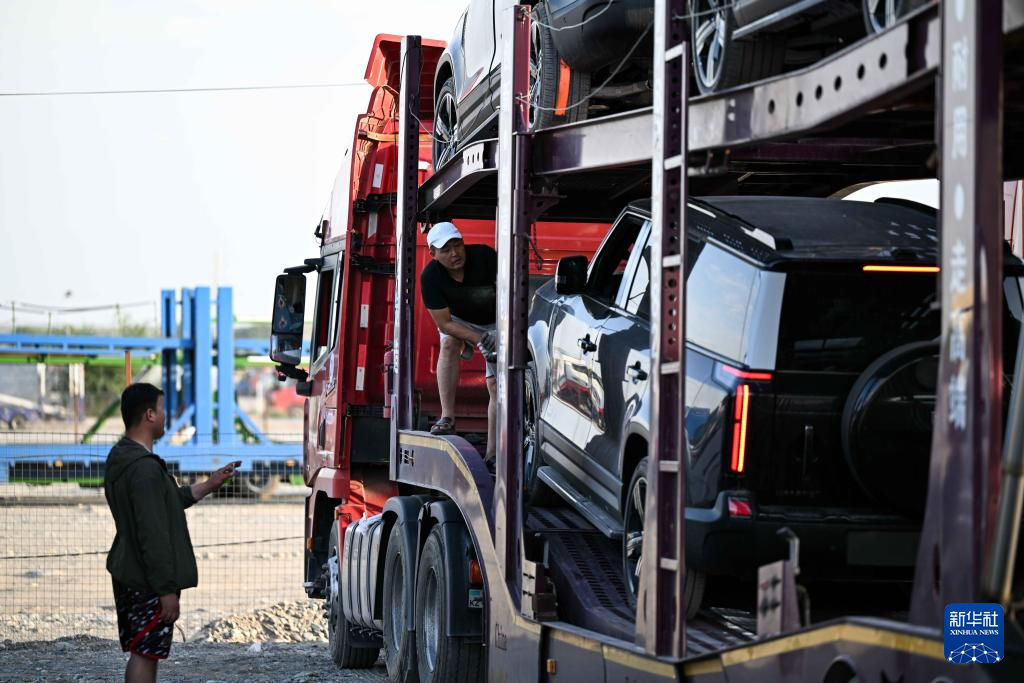 5月22日,運輸公司的工作人員駕駛從中國進口的新能源汽車駛向哈薩克斯坦扎爾肯特鎮的中轉停車場。新華社記者 李任滋 攝