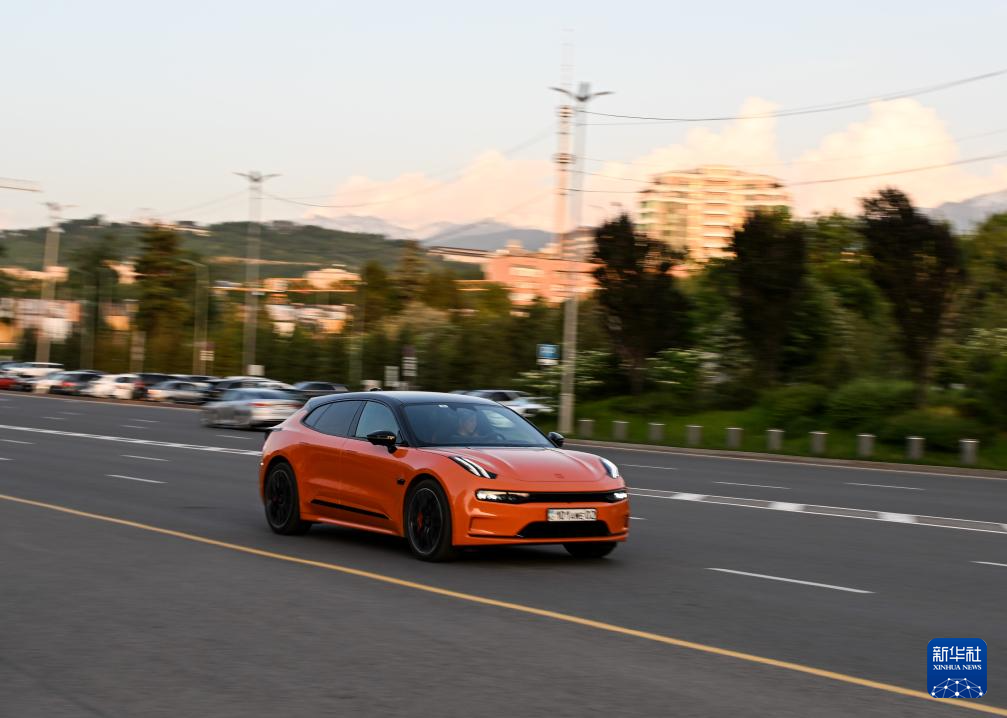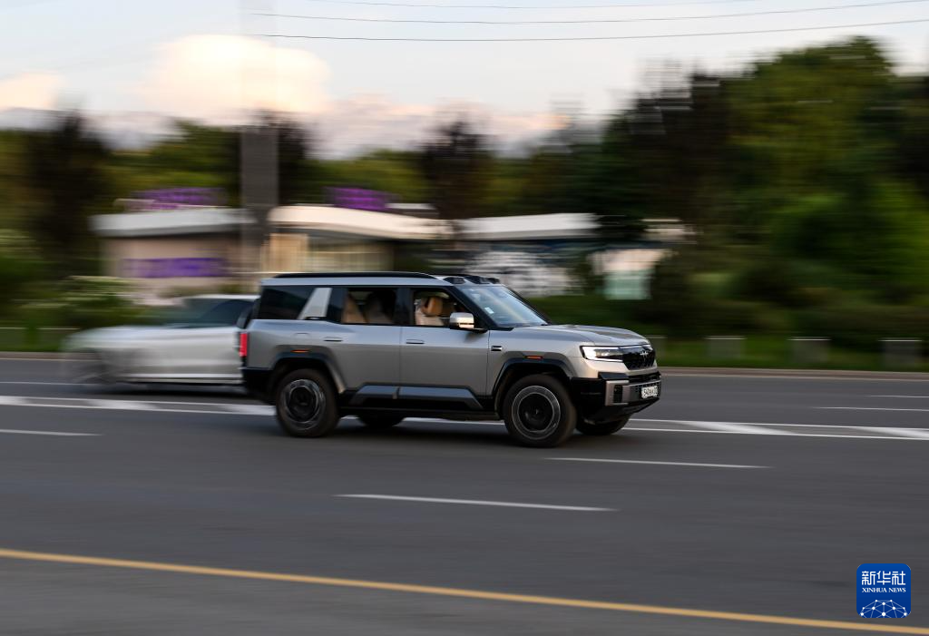 5月15日,一輛中國品牌新能源汽車行駛在哈薩克斯坦阿拉木圖市區。新華社記者 李任滋 攝