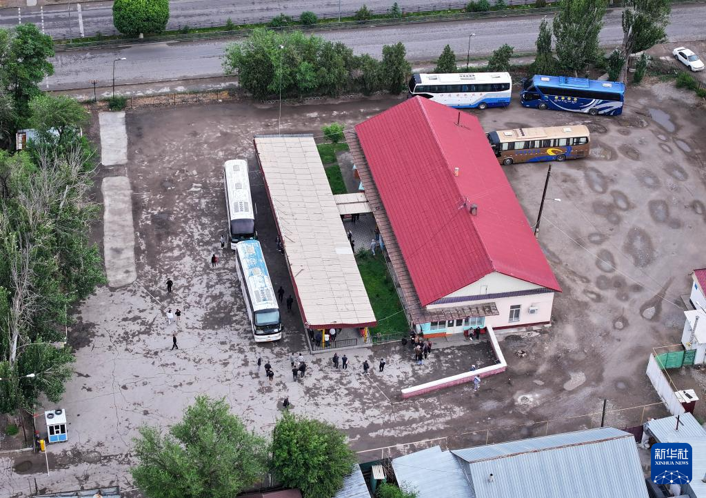 5月24日清晨,“擺渡人”在哈薩克斯坦扎爾肯特鎮汽車站準備登上返回霍爾果斯的大巴。新華社記者 李任滋 攝