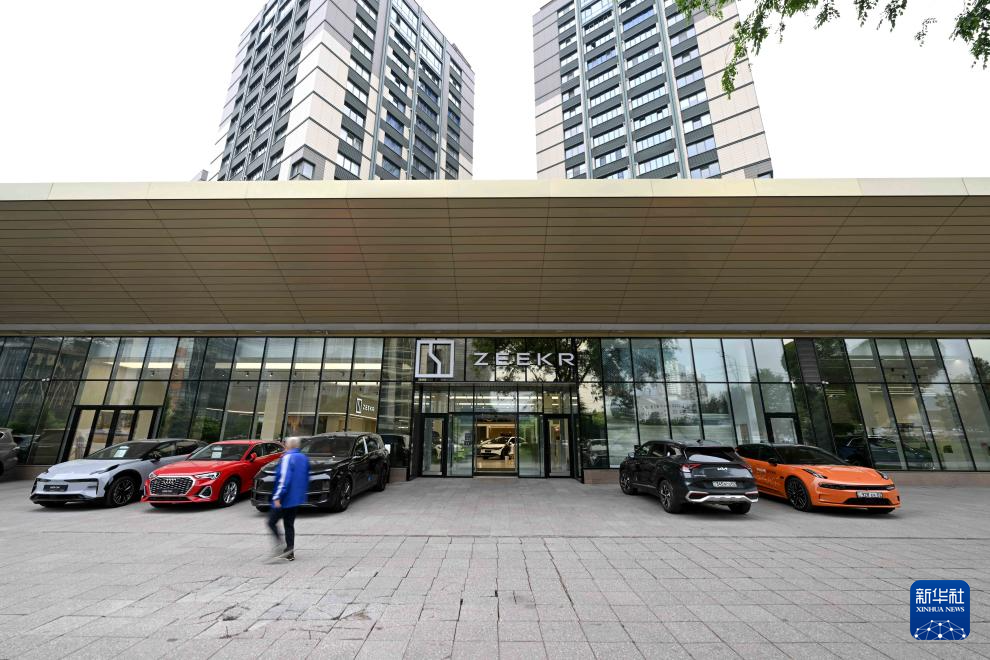 5月26日,在哈薩克斯坦阿拉木圖市區,一名男子從一家中國品牌新能源汽車門店前走過。新華社記者 李任滋 攝