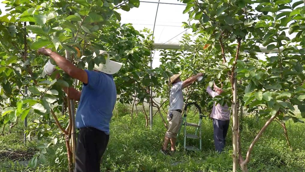 位于福建省泉州市惠安縣輞川鎮下江村的家興家庭農場,水果掛滿枝頭,一片豐收景象。這里曾經面臨海水倒灌、土壤硬化嚴重等問題。2013年,惠安縣家興家庭農場成立,陸續流轉了300多畝鹽堿地,由此走上了鹽堿荒地開發之路。